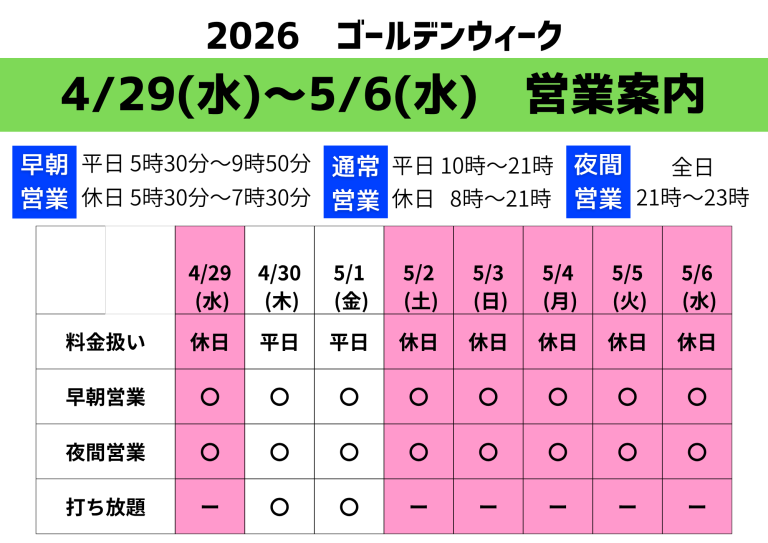 | 夜間営業 | 21:00 – 23:00 | 21:00 – 23:00 |