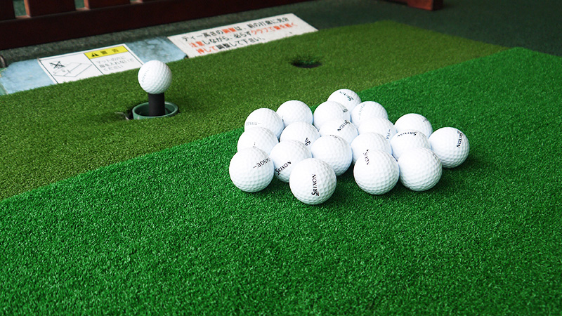 レンジボールはコースボールと比べ5%~8%飛距離が落ちますが、連続して何十球、何百球打つことを考え、衝撃が少ないレンジボールを使用しています。