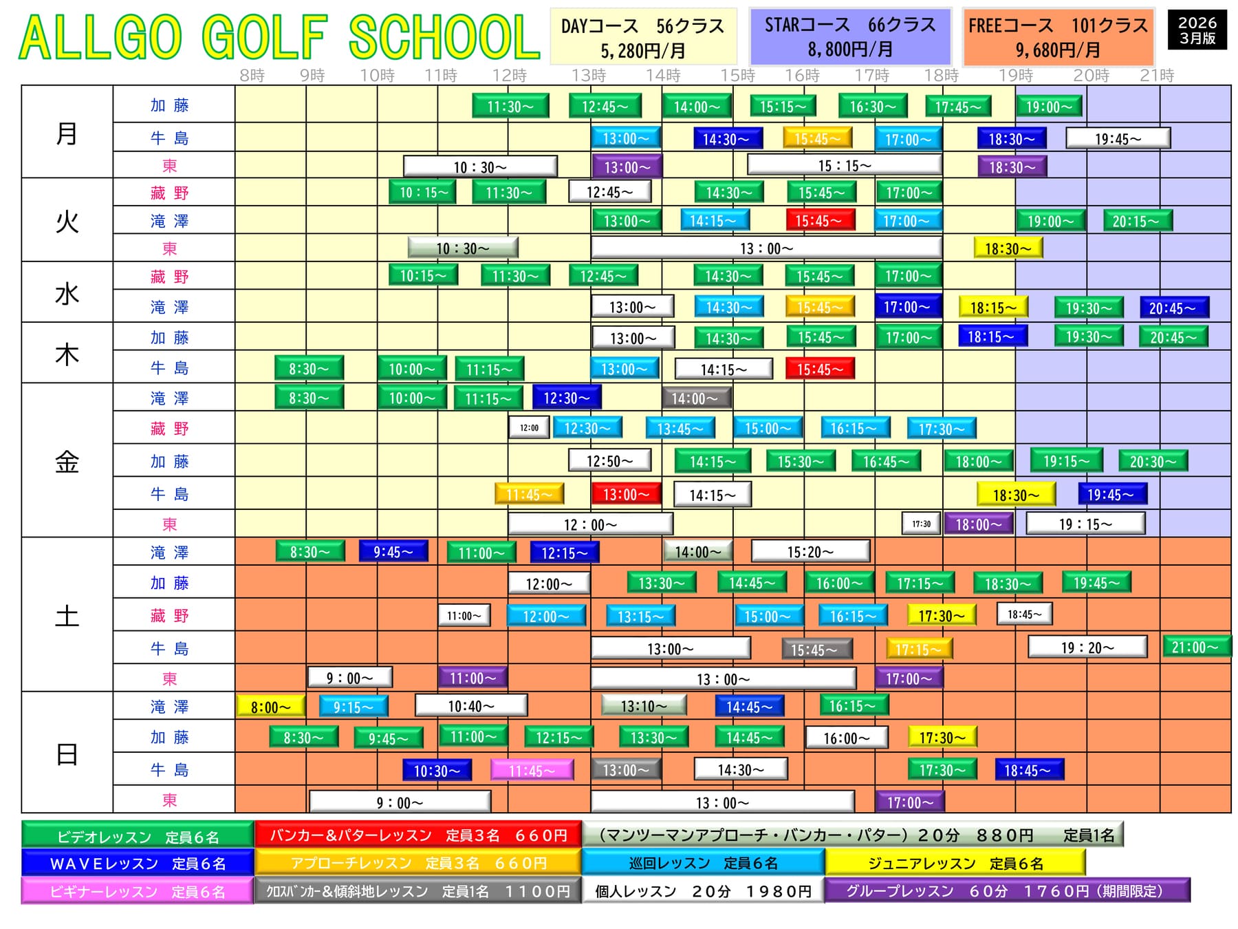 これからゴルフを始める方、上達をしたい方などのニーズに応えた月謝制による予約型のゴルフスクールです。毎日レッスンに来ても、また週2~3回来ても何回受けても料金は一緒です。レッスン内容は、個人レベルに合わせたスウィング作りやビデオを用いて矯正ポイントをわかり易く指導をしています。予約制により、人数の制限もしていますから、通常のゴルフスクールに比べて上達は早いです。